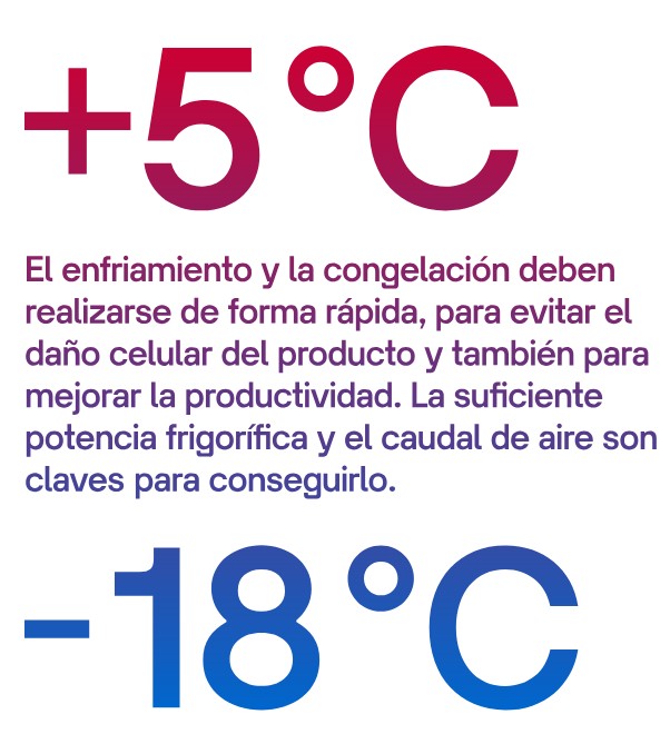 Nuestros túneles de congelación y enfriamiento mecánicos, con ventilación forzada, aseguran la turbulencia de aire que el producto requiere para conseguir un rápido intercambio térmico.